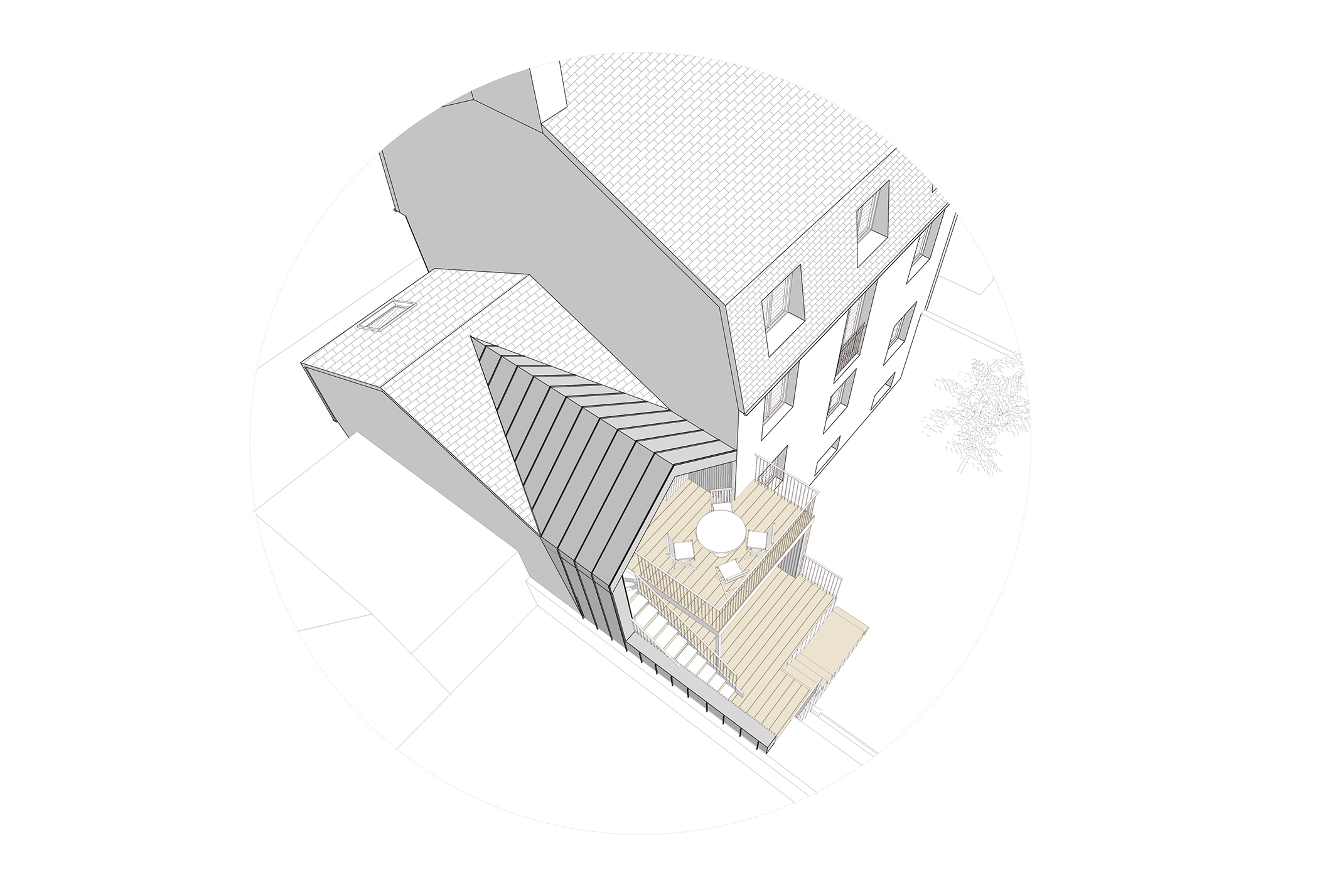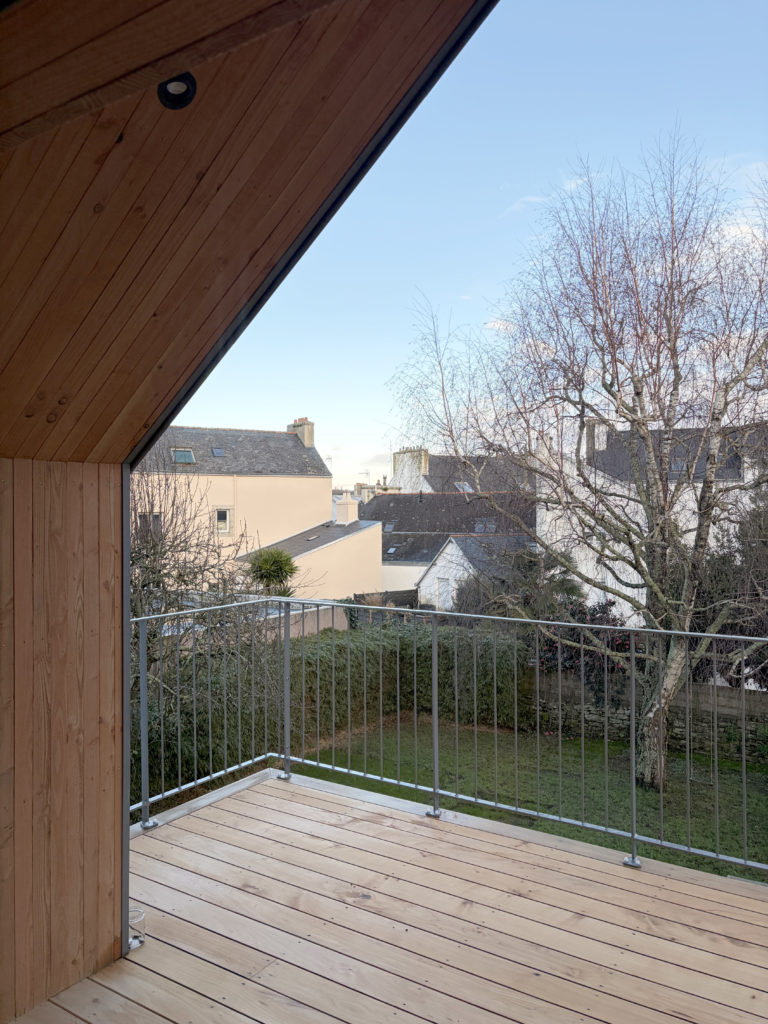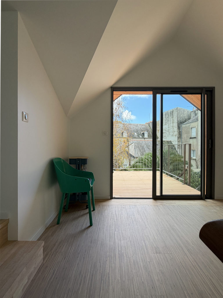 En façade arrière d’un immeuble d’habitation, cette annexe adossée au bâtiment principal à l’usage de l’appartement situé à R+1 appelait à se transformer. Deux raisons dominantes ont motivé ce projet : créer un passage direct depuis le niveau de vie, situé à R+1, vers le jardin, et, dégager, dans le pignon un passage direct entre 2 espaces de vie commune : la cuisine et la salle à manger. Le projet propose donc de modifier la forme de la toiture de l’annexe pour favoriser ces passages, non envisageable dans la configuration existante. La terrasse suspendu appelle dès lors à un temps d’arrêt, de transition entre le jardin et l’intérieur, la promiscuité d’un espace clos et la diversité d’un jardin de centre ville.