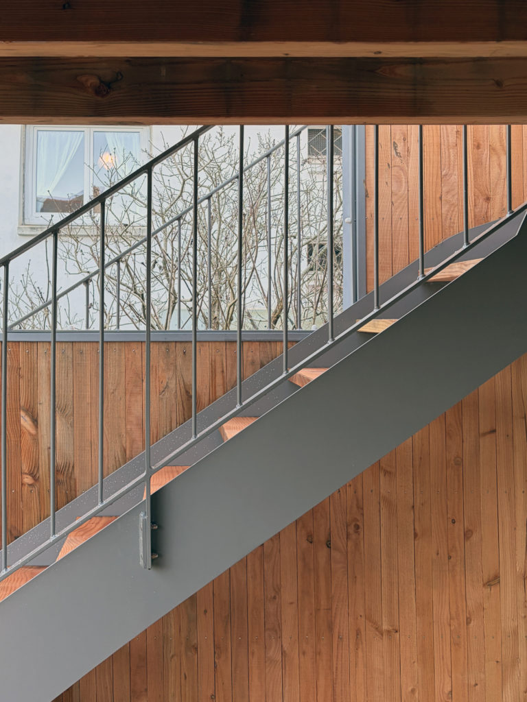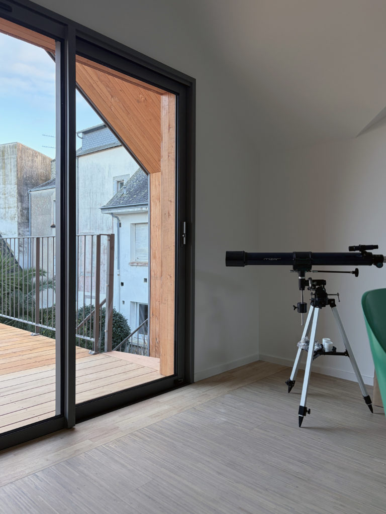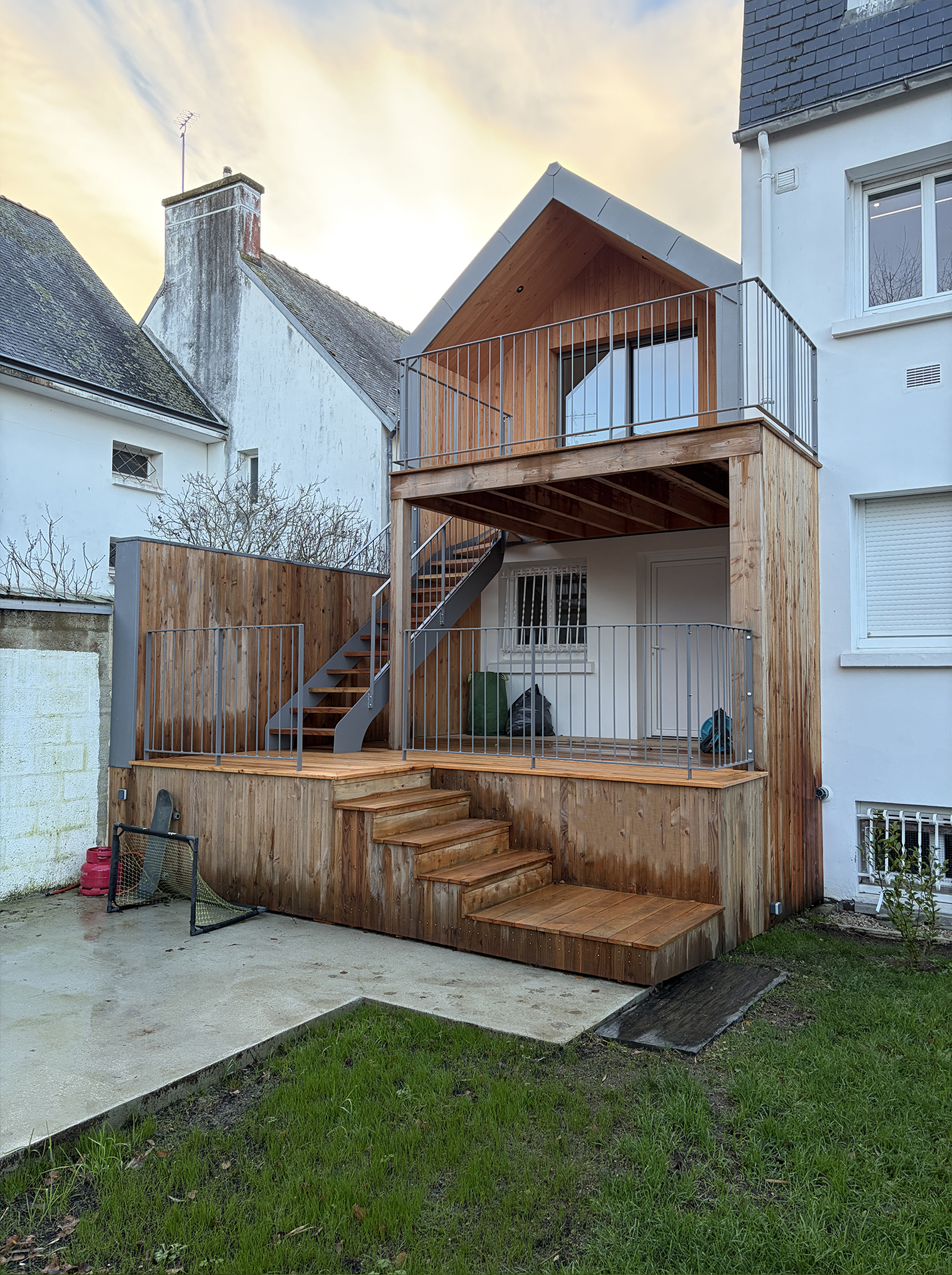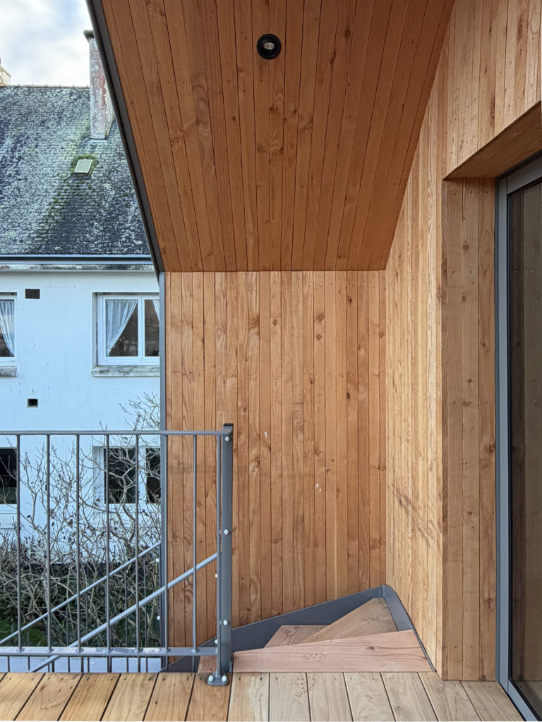 En façade arrière d’un immeuble d’habitation, cette annexe adossée au bâtiment principal à l’usage de l’appartement situé à R+1 appelait à se transformer. Deux raisons dominantes ont motivé ce projet : créer un passage direct depuis le niveau de vie, situé à R+1, vers le jardin, et, dégager, dans le pignon un passage direct entre 2 espaces de vie commune : la cuisine et la salle à manger. Le projet propose donc de modifier la forme de la toiture de l’annexe pour favoriser ces passages, non envisageable dans la configuration existante. La terrasse suspendu appelle dès lors à un temps d’arrêt, de transition entre le jardin et l’intérieur, la promiscuité d’un espace clos et la diversité d’un jardin de centre ville.