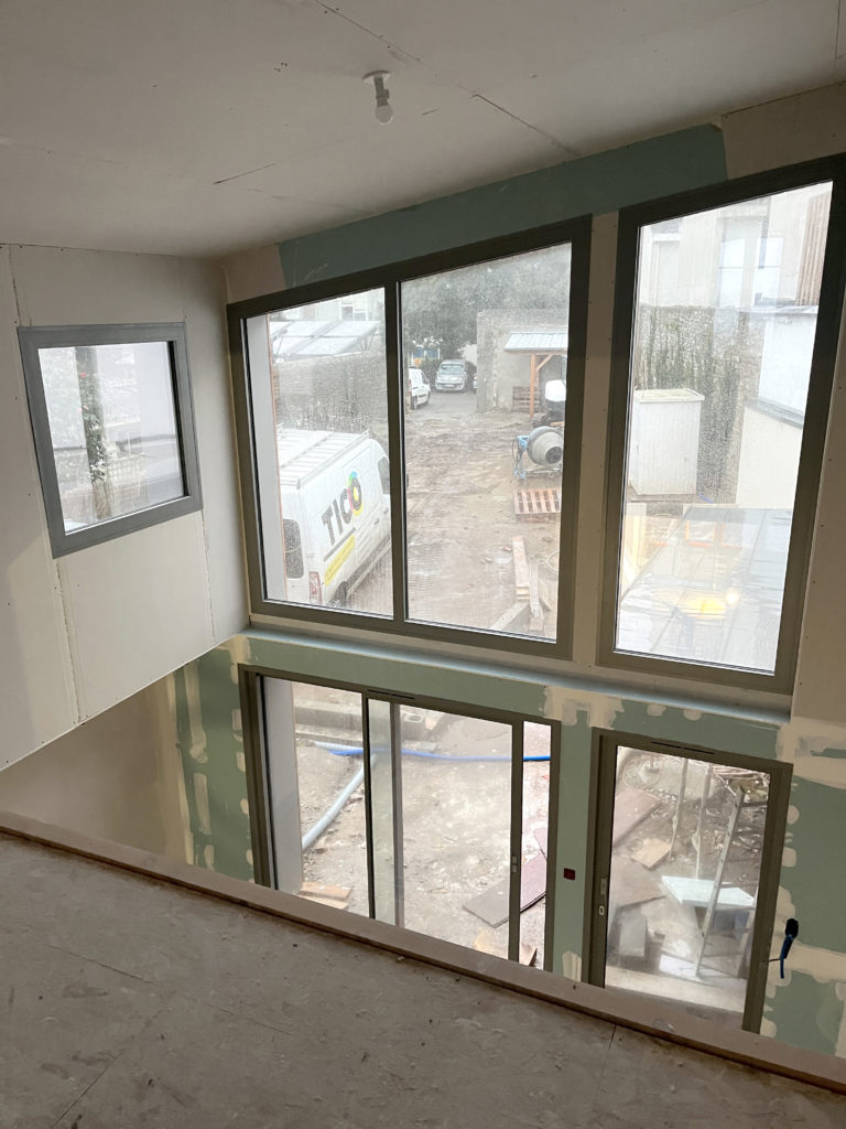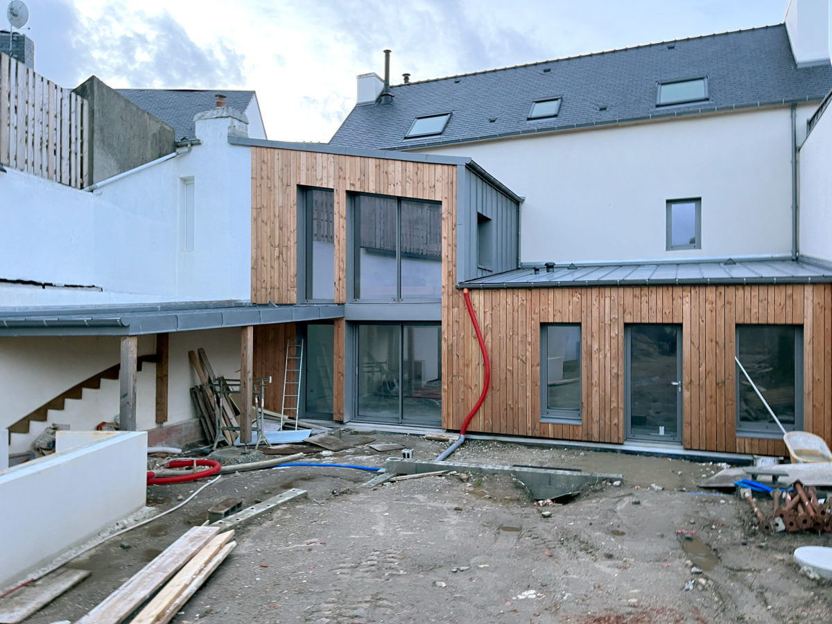 Située sur une parcelle incluant une maison individuelle classée, ce projet propose une extension en ossature bois installé en front de jardin en opposition avec la façade principale, classique, dont les ouvertures et les ornements sont rénovés consciencieusement.